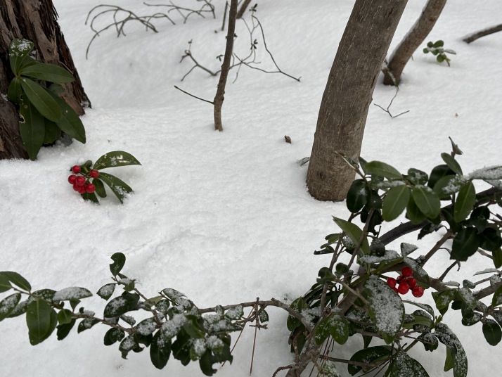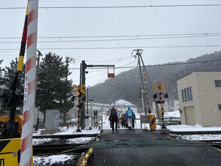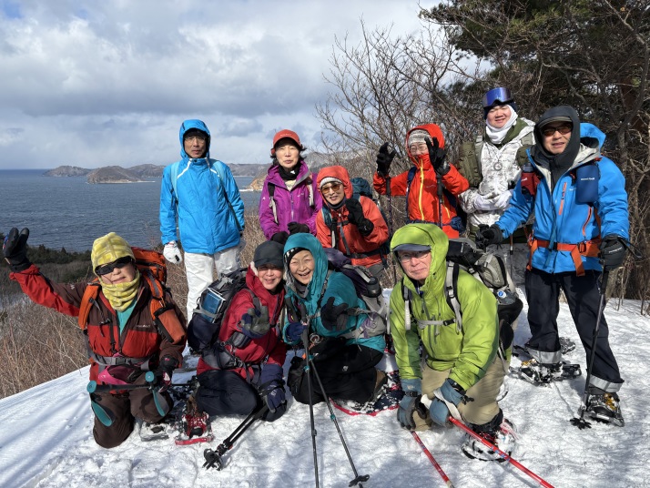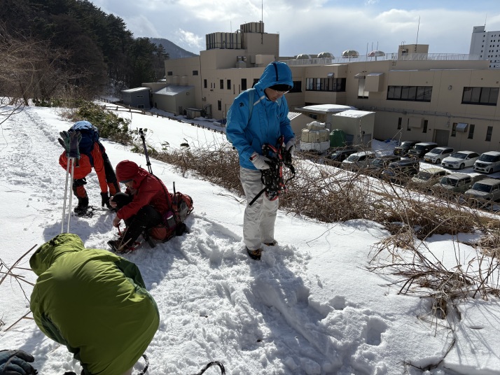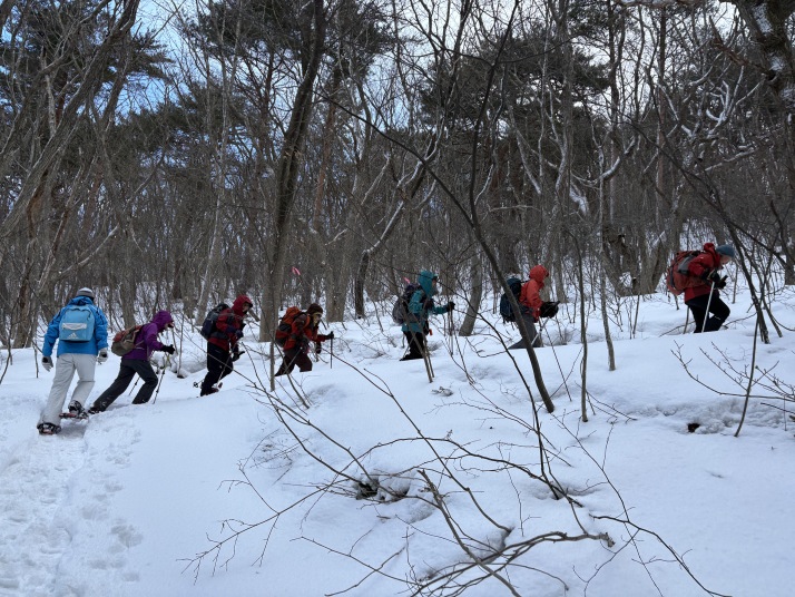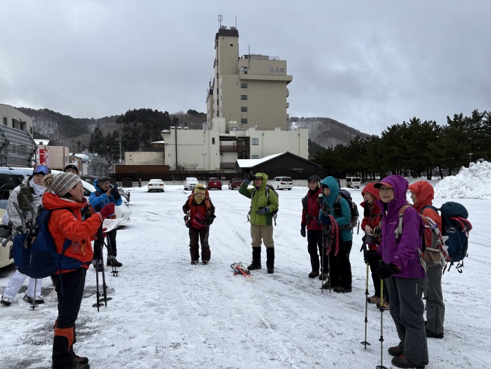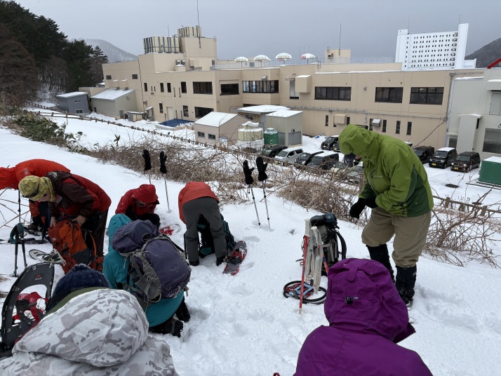 浅虫温泉駅前の駐車場に集合し、CLからコースの説明を受け、登山口の水族館まで歩く。水族館裏からは例年だと雪の壁を登ったところで、スノーシューを装着するのだが、すっかり階段が見えている。