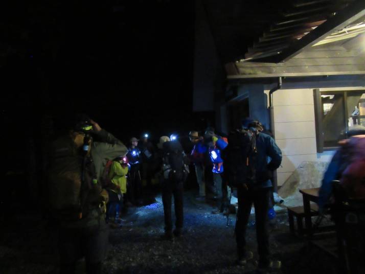 当日、起床(3:00~4:00)し、朝食(4:30)を取り、まだ暗い中、ヘッドライトを装着してこもれび山荘を5:00に出発。仙丈ヶ岳へ行く登山道入口(2つある内緩やかな方)から始動した。やや急登の樹林帯を歩き、途中衣服調整しながら二合目に到着。