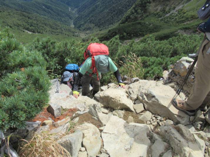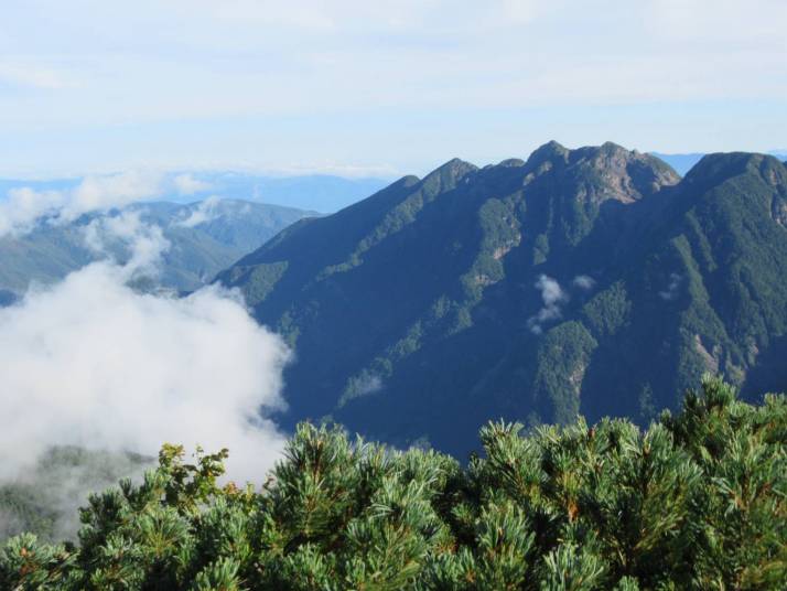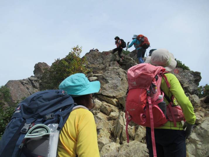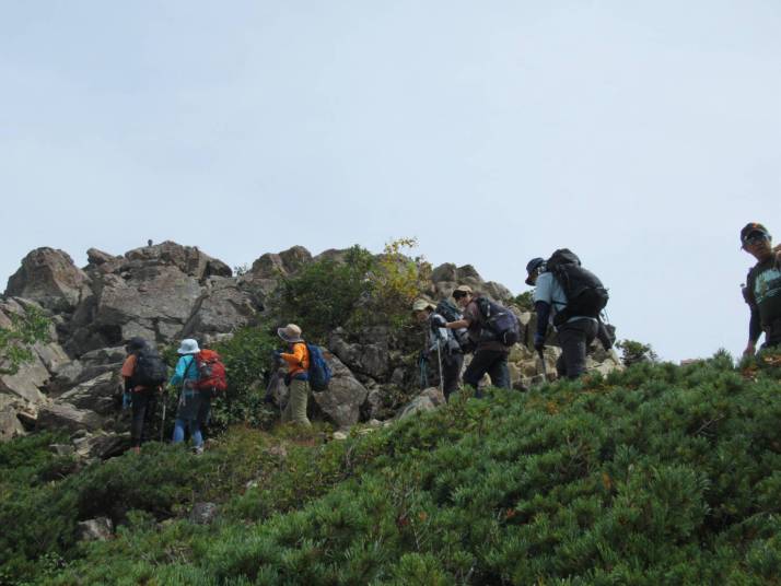 樹林帯を抜けると展望が開け、六合目を過ぎたら小仙丈ヶ岳が見えた。結構予定時間より早いペースで登ってきた。8時過ぎ、九合目小仙丈ヶ岳山頂につき、A班は記念写真を撮り、仙丈ヶ岳へ向かった。少し歩くと急な下り(岩)があり、コース通りが大変だった。下りて、仙丈ヶ岳へ向けての緩やかな稜線歩きになった。